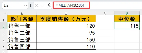✅ 公式:=MEDIAN(B2:B5)