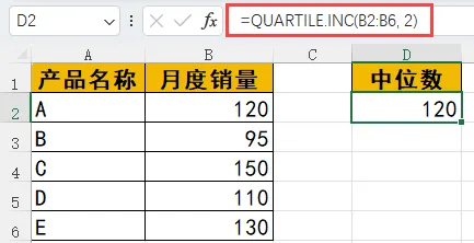 ✅ 公式:=QUARTILE.INC(B2:B6, 2)