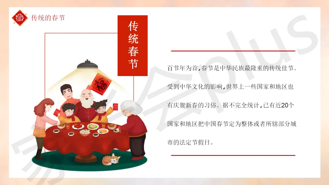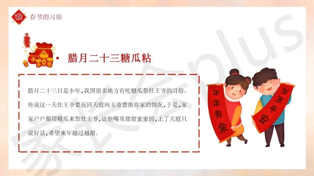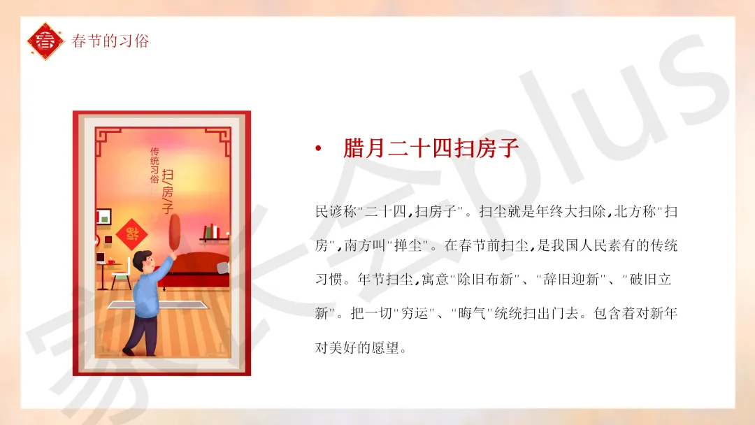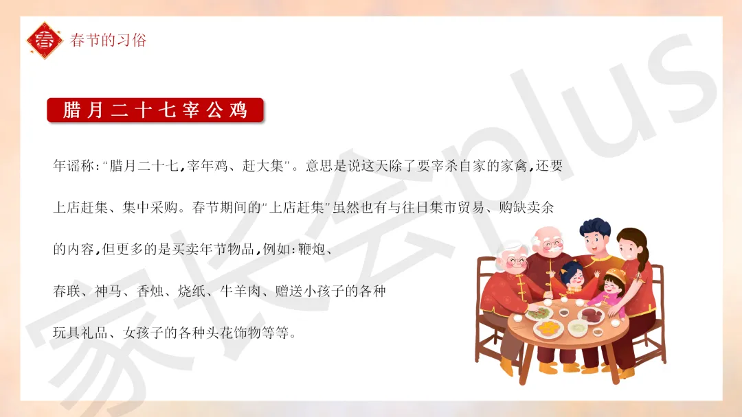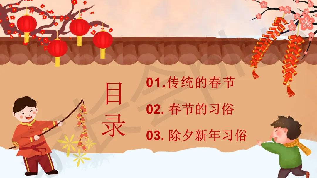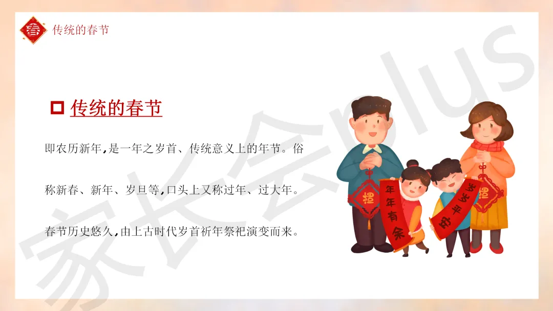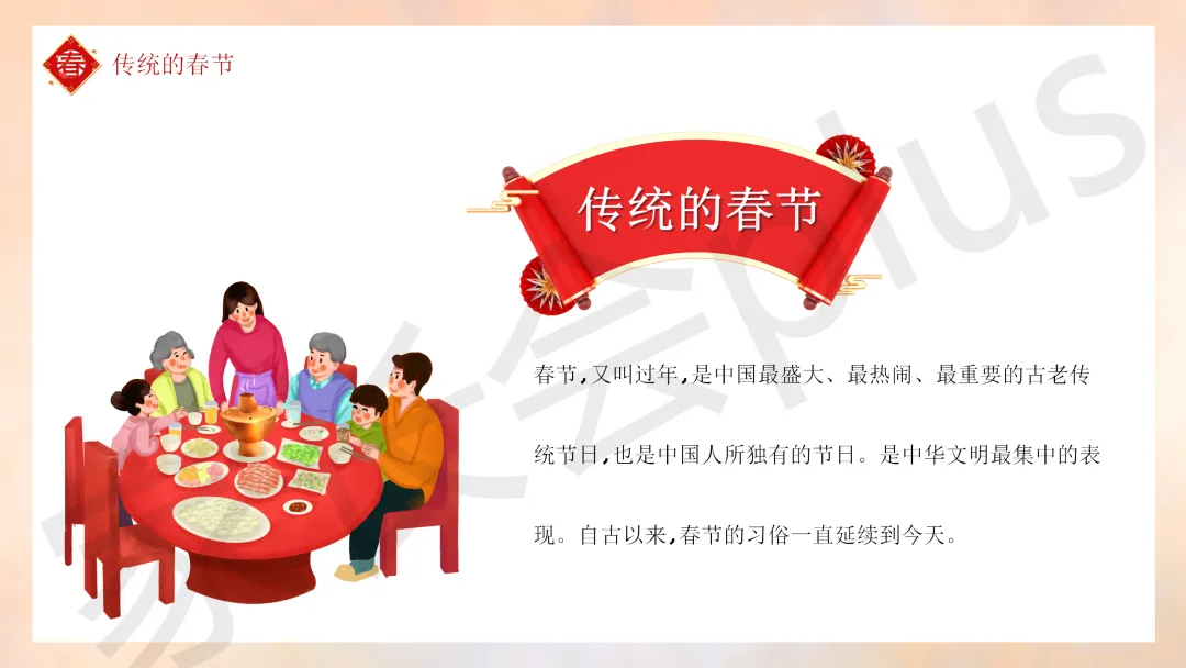 这份「中小学传统节日春节知识科普班会 PPT 课件《春节的习俗》模板推荐」就介绍到这里了,希望本次分享的课件对您有用哈。
