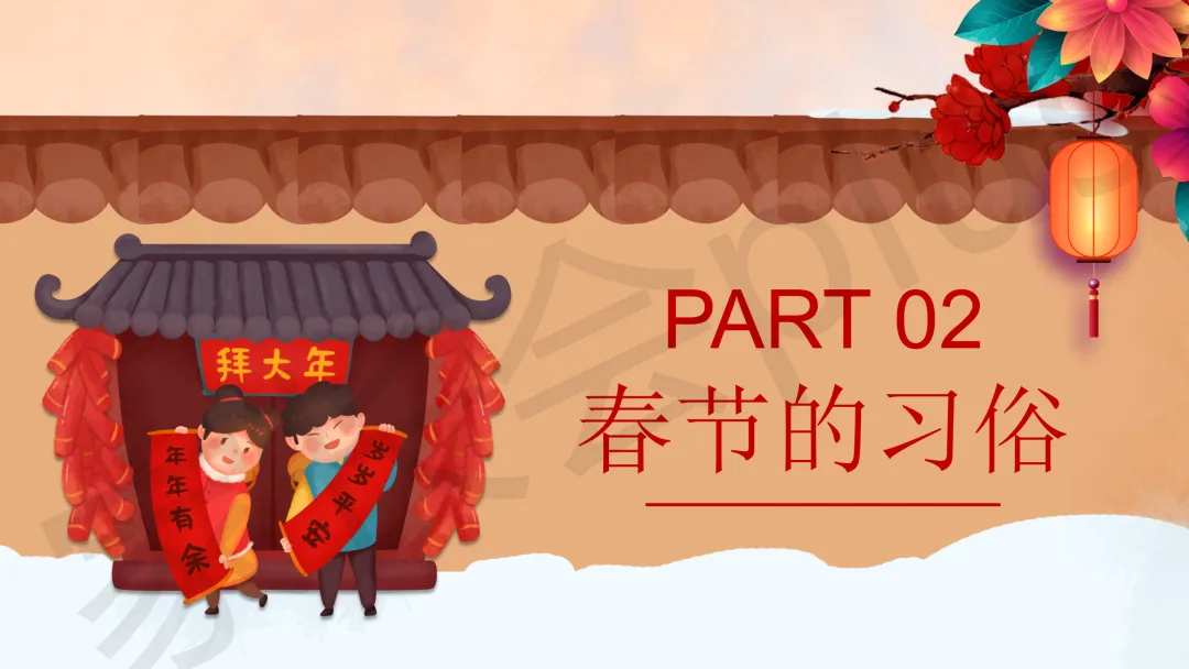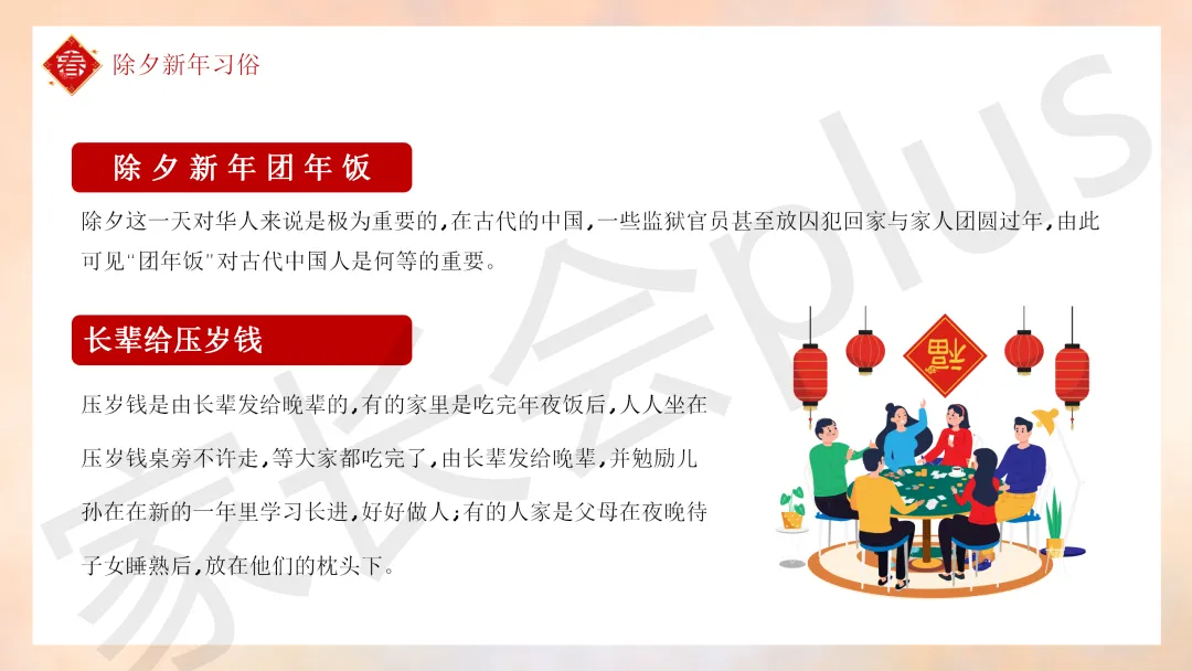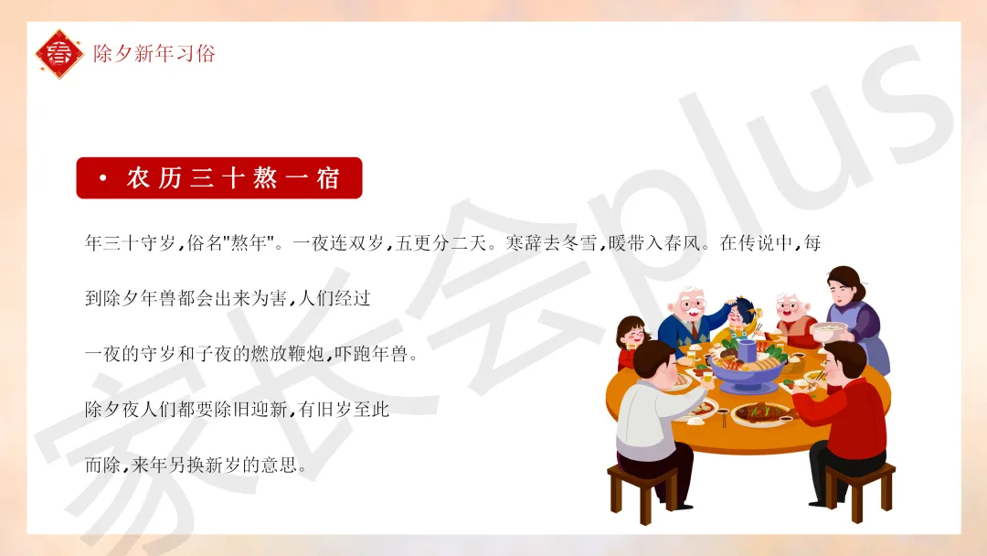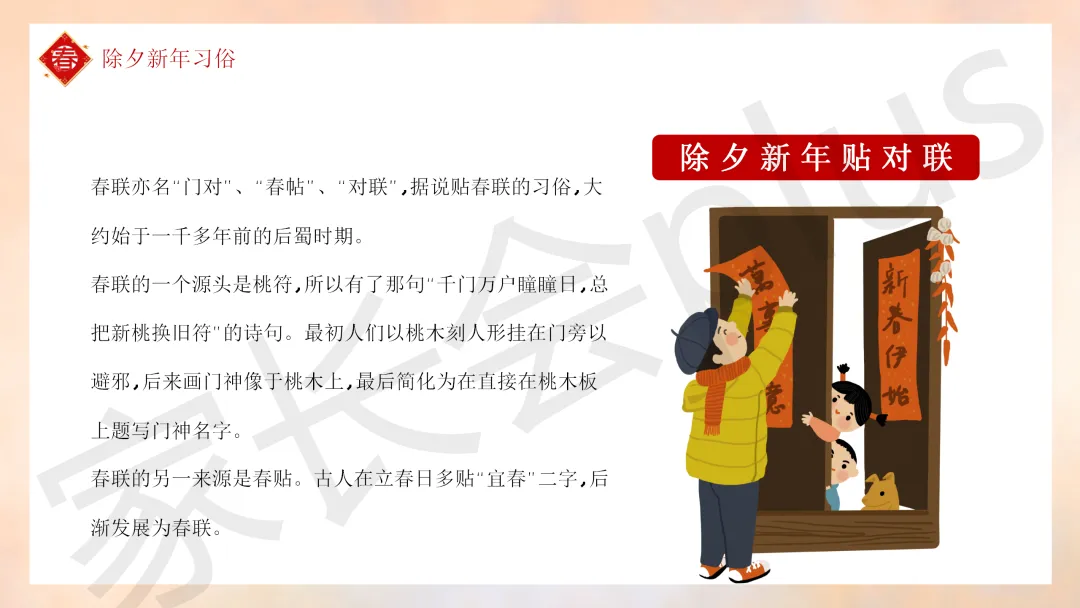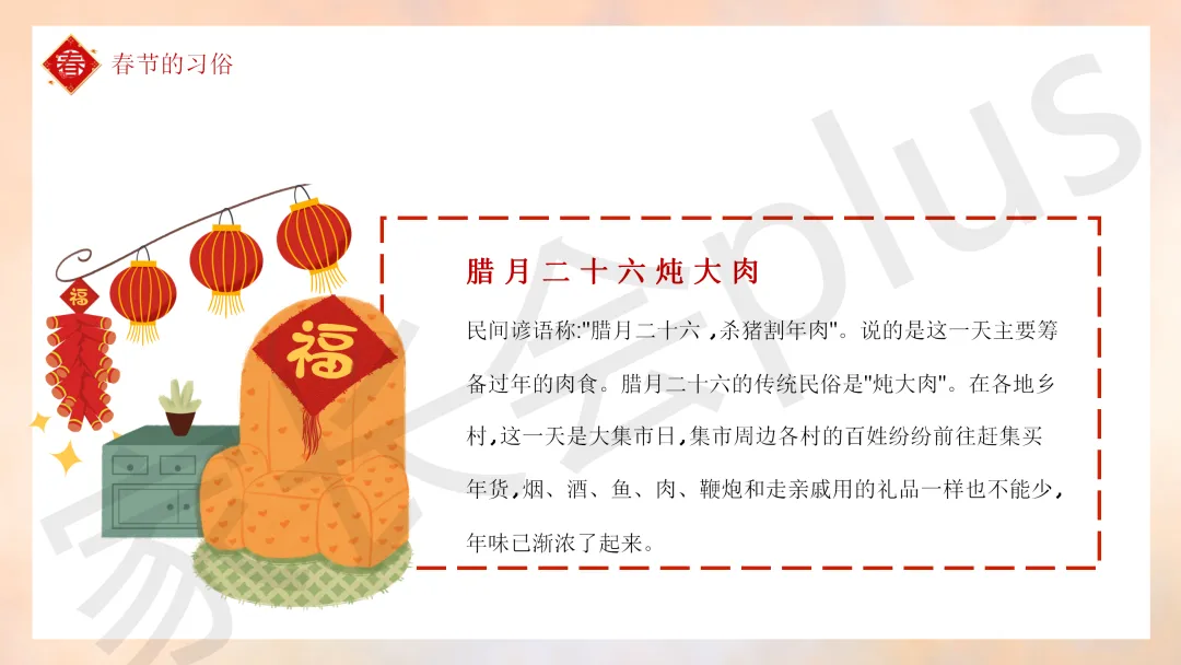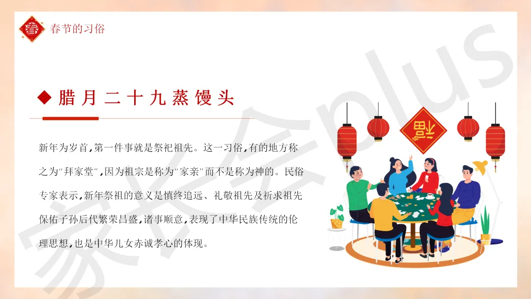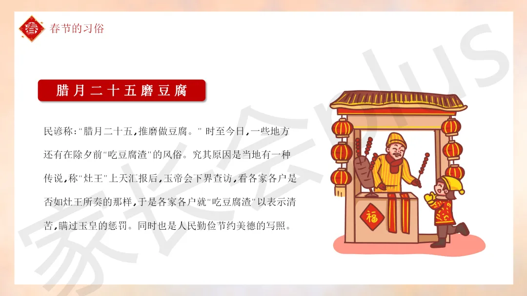 这份「中小学传统节日春节知识科普班会 PPT 课件《春节的习俗》模板推荐」就介绍到这里了,希望本次分享的课件对您有用哈。