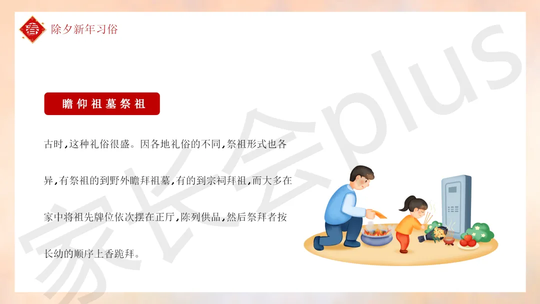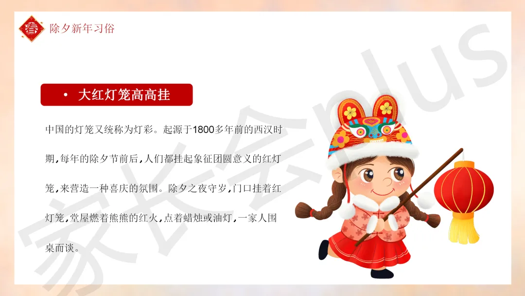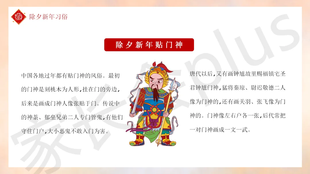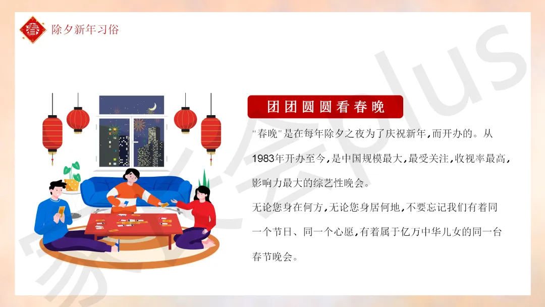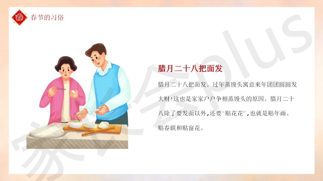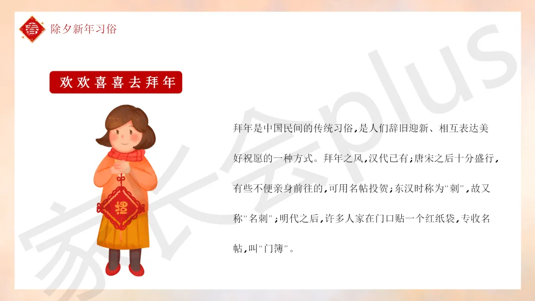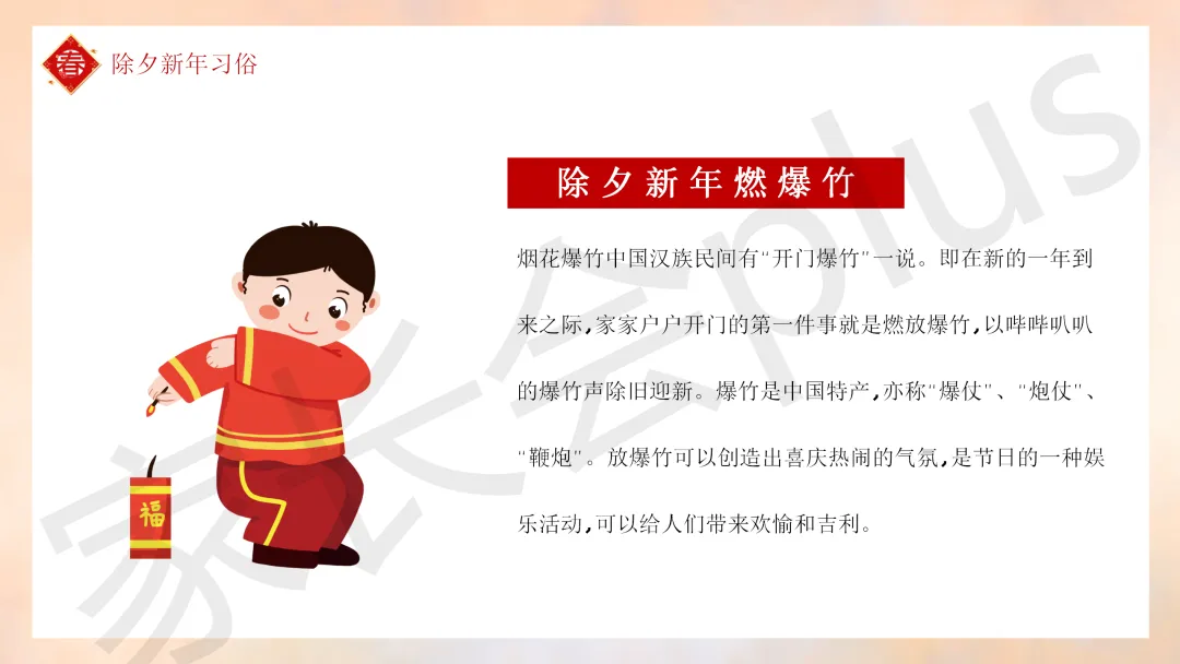 这份「中小学传统节日春节知识科普班会 PPT 课件《春节的习俗》模板推荐」就介绍到这里了,希望本次分享的课件对您有用哈。