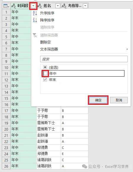 3. 点开“时间段”的筛选按钮 --> 取消勾选“年中”--> 点击“确定”