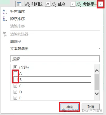 4. 点开“考核等级”旁边的筛选钮 --> 取消勾选 A 和 B --> 点击“确定”