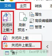 6. 选择菜单栏的“主页”-->“关闭并上载”-->“关闭并上载至”