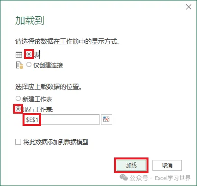 7. 在弹出的对话框中选择“表”--> 选择“现有工作表”及所需上载至的位置 --> 点击“加载”