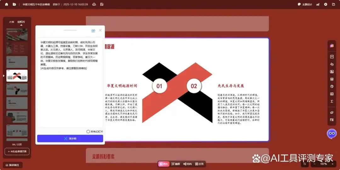 核心优势:百万级教育类素材(学科图标、实验示意图、思维导图模板),AI自动排版能根据内容体量智能调整布局,拖拽式编辑灵活修改细节。但内容专业性依赖用户输入,更适合“已有核心内容,需要美化”的场景。