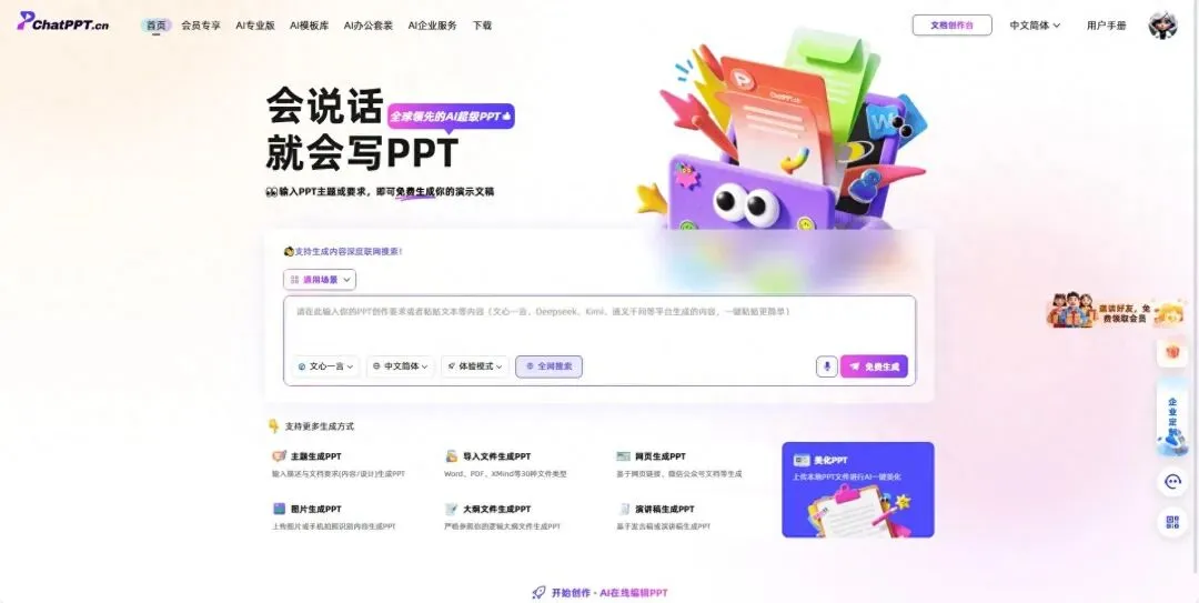 便捷性决定了用户是否愿意长期使用一款工具。在操作流程上,ChatPPT的设计极为清晰:无论用户是有现成大纲(上传文档)还是毫无头绪(输入主题),都能在四到五步内生成可用的PPT初稿,后续编辑功能(如内容润色、扩写、图表生成、文生图等)也集成在界面显眼位置,无需复杂学习。相比之下,部分国际工具因界面复杂、功能分散,导致用户上手成本较高。