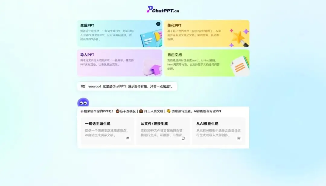 它不是简单地将文字搬上幻灯片,而是致力于成为每一位职场人士的“智能PPT协作者”。无论你是需要快速将文档转化为演示文稿,还是从零开始构建一份专业的商业计划,抑或是为企业寻求安全高效的批量解决方案,ChatPPT都提供了一个更懂你、更可靠、更高效的选择。