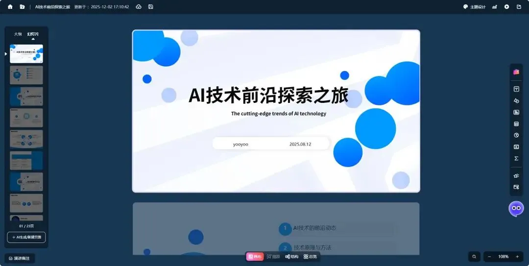 - 高校教师/培训师:输入课程主题,快速生成逻辑清晰的大纲和内容页,再通过“AI文生图”功能丰富插图,节省了大量搜集素材的时间。