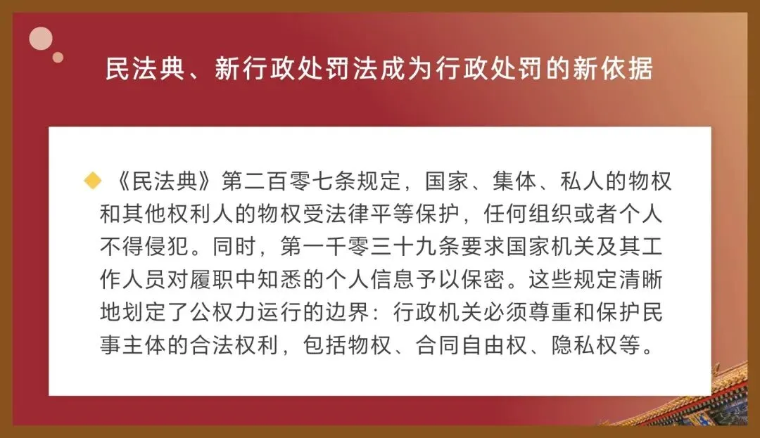 《民法典》第二百零七条规定,国家、集体、私人的物权和其他权利人的物权受法律平等保护,任何组织或者个人不得侵犯。同时,第一千零三十九条要求国家机关及其工作人员对履职中知悉的个人信息予以保密。这些规定清晰地划定了公权力运行的边界:行政机关必须尊重和保护民事主体的合法权利,包括物权、合同自由权、隐私权等。行政执法不再是单向的“命令-服从”过程,而是在法律框架内,平衡公共利益与个人权益的互动过程。我们在实施行政处罚时,必须首先以民法典为镜鉴,审视执法行为是否逾越了权限,是否构成了对公民、法人合法权益的不当干预。“法无授权不可为,法定职责必须为”的原则,在此背景下显得尤为突出。