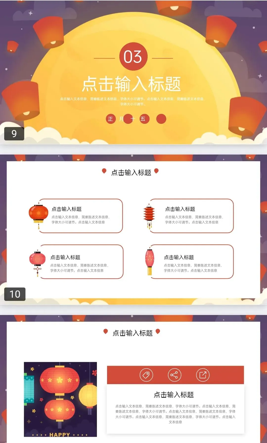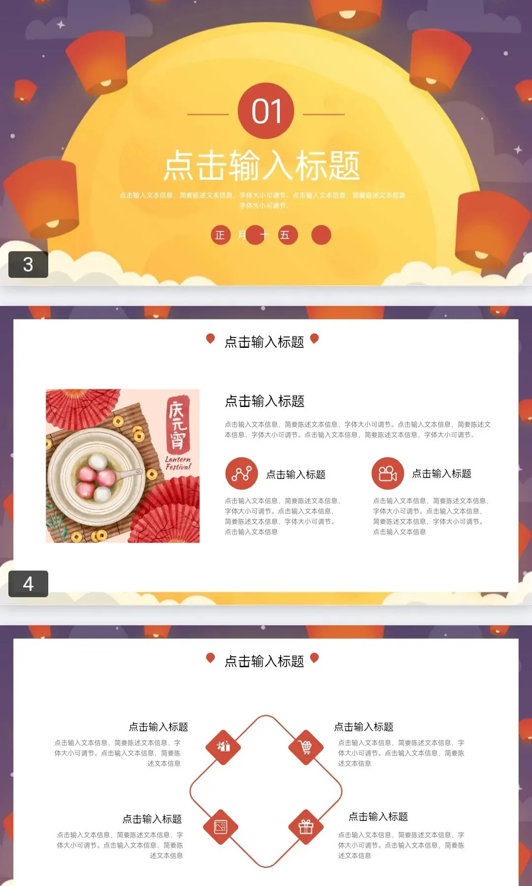 分享一组元宵节专属PPT模板,适配节日班会、活动策划、节日汇报等多种场景,国风氛围感拉满,版式简洁易编辑,可直接替换内容使用,轻松搞定元宵相关PPT制作~