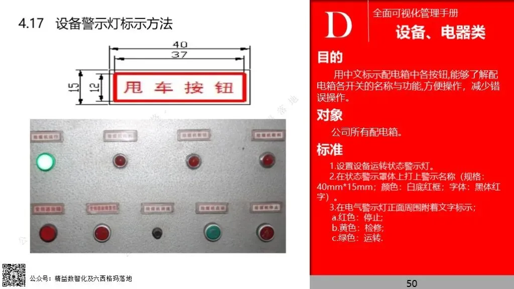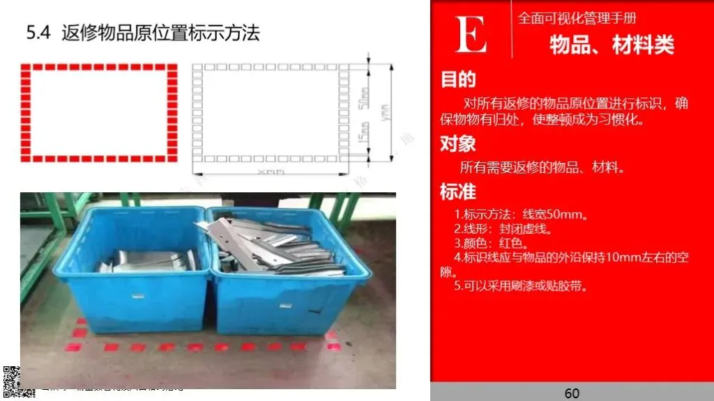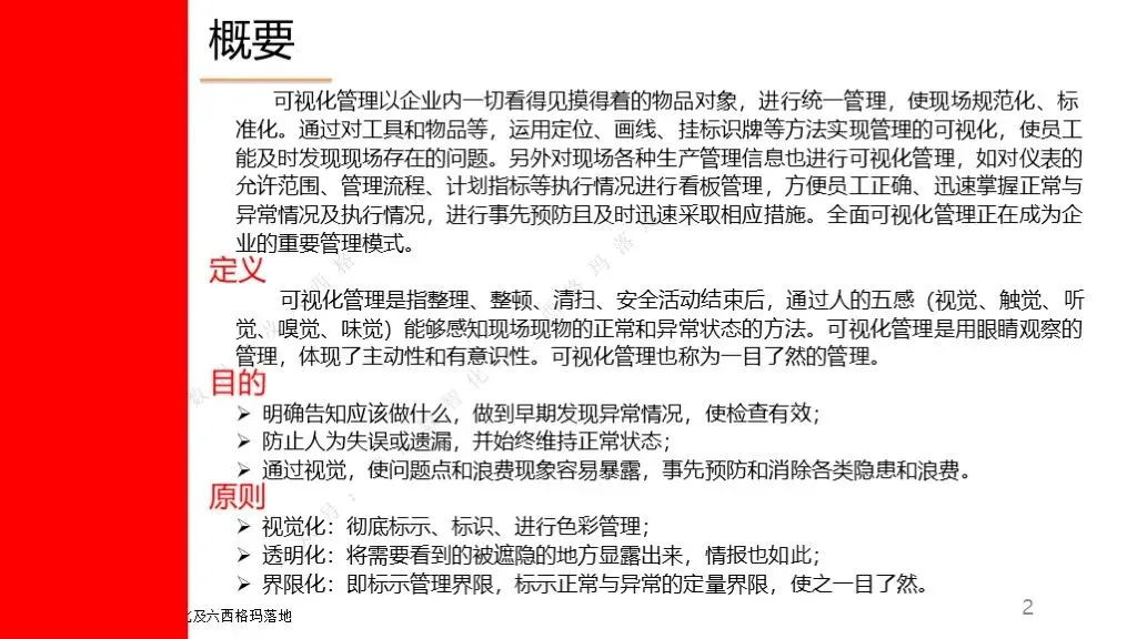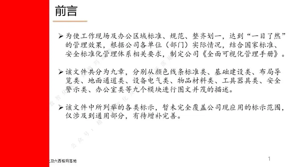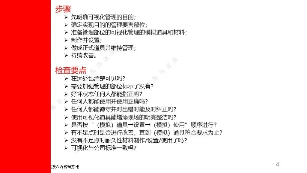 - 第5步:检查验收与问题整改(查落地、补漏洞),全面检查目视化落地效果,确保所有区域符合设计标准,无遗漏、无偏差,对未达标区域限期整改。