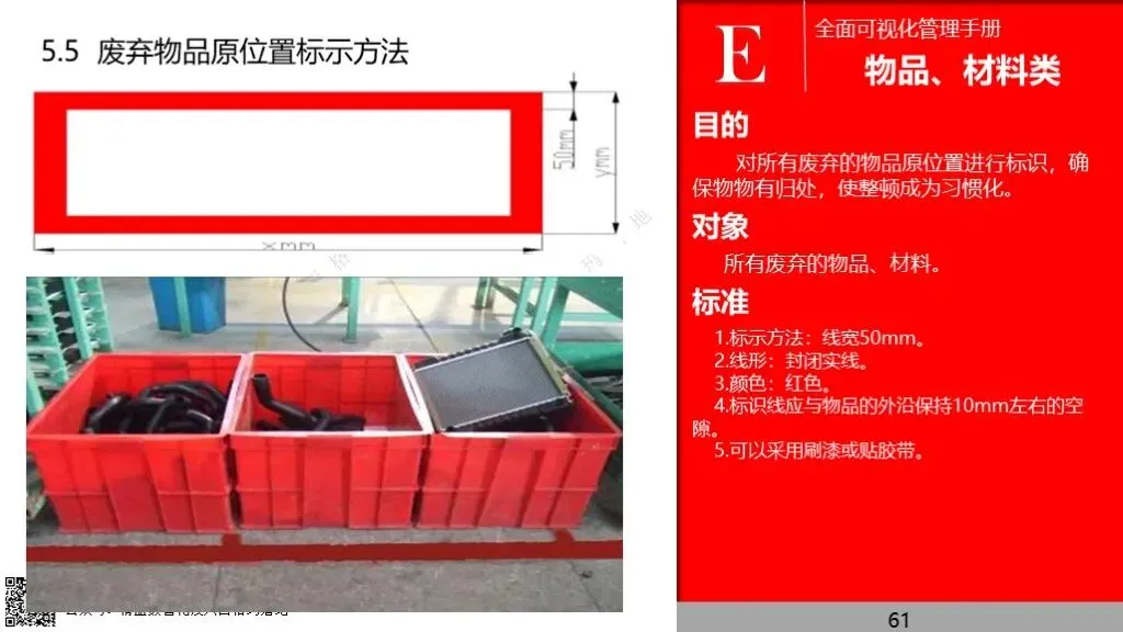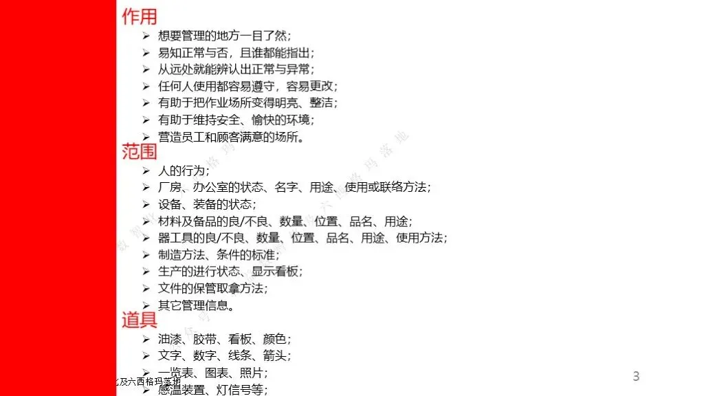 - 3.1 现场准备,试点区域先完成 5S 整理整顿(清除无用物品、规整物料 / 设备),为目视化落地扫清现场障碍