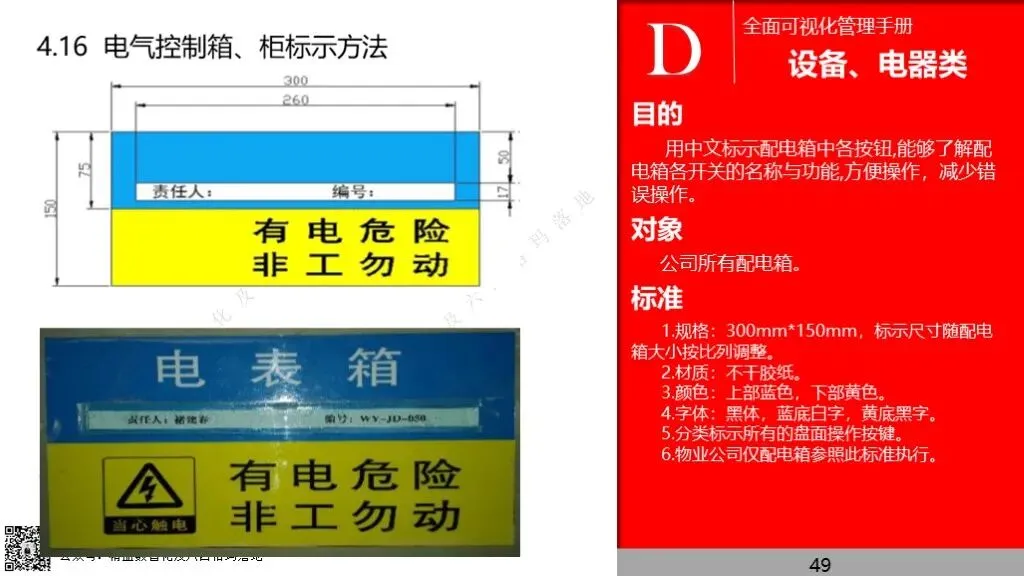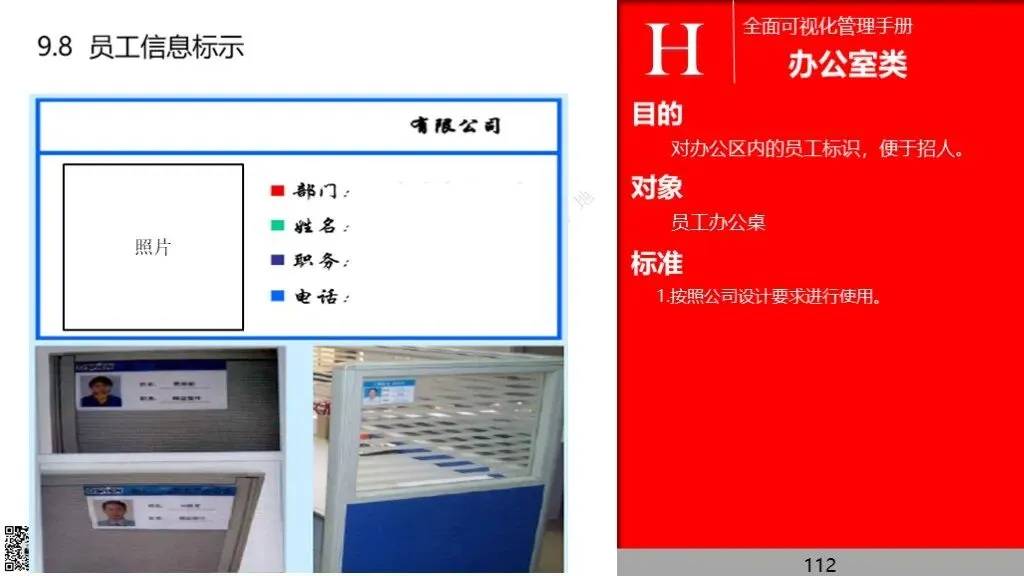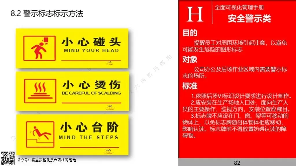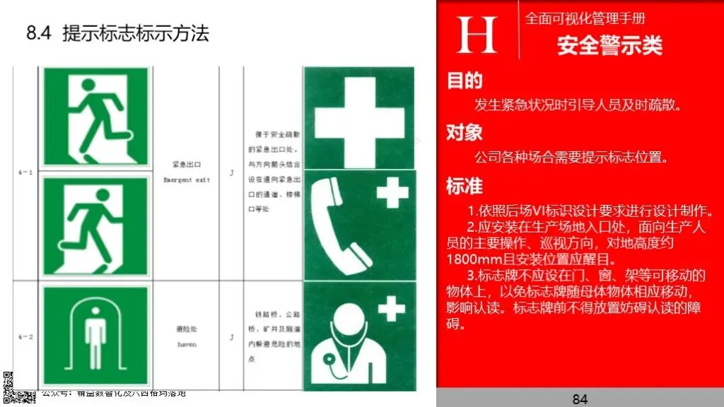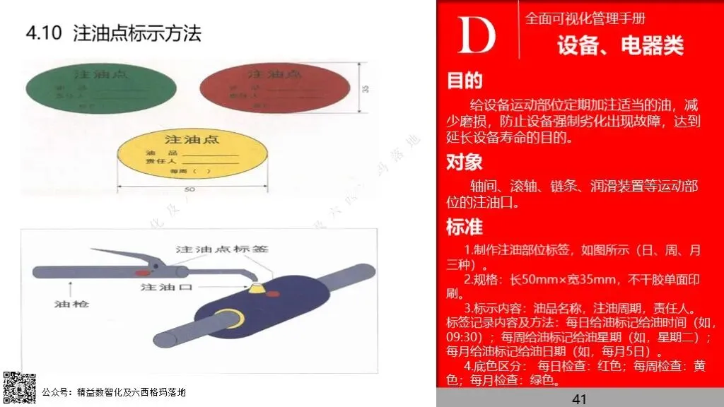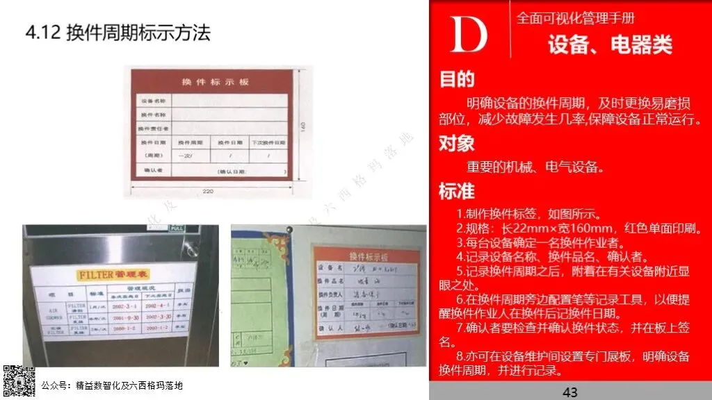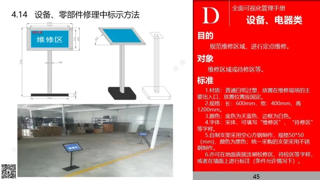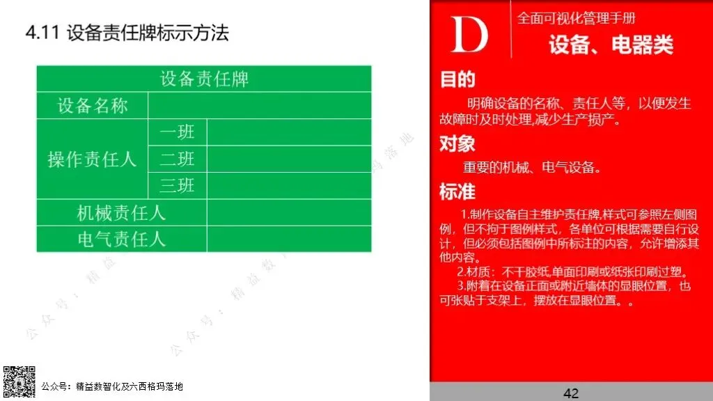 4.3 培训内容,目视化标识 / 看板的识别方法、信息更新要求、维护责任- 4.4 明确维护责任:制定《目视化管理维护责任表》,按 “谁使用、谁负责” 原则,将每个标识、看板、标线的维护责任落实到具体员工 / 班组长,明确 “每日检查、及时更新、破损立即更换” 的要求