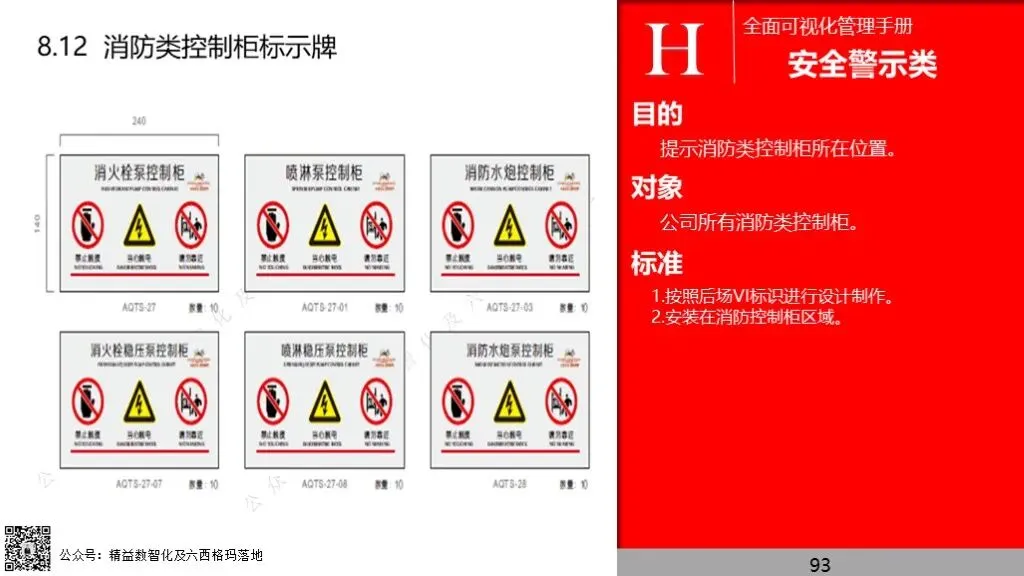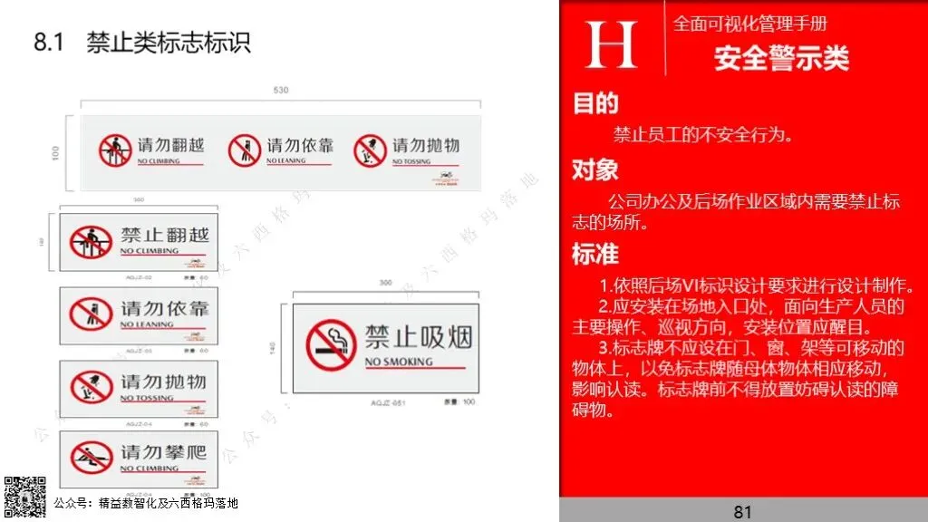 3.2 按标制作与张贴,制作标识、看板、标线,由专项小组现场指导施工,确保张贴 / 喷涂位置醒目、不影响操作3.3 现场实操验证,组织试点区域的班组长、一线员工实际使用,收集反馈问题(如 “标识字体太小看不清”“看板位置太高不好更新”“定置线太窄物料不好摆放” 等)3.4 优化调整方案:针对收集的问题,完成设计标准的调整,更新目视化设计标准手册,确保试点区域目视化贴合实际操作第4步:全面推广,将试点优化后的方案,在全车间 / 全企业按标准复制落地,同时完成全员培训,确保员工懂识别、会使用、能维护4.1 分区域批量落地,按 “先易后难” 原则,先推广物料、安全区域,再推广生产、设备、质量区域,最后推广班组管理区,每个区域安排专项小组成员现场督导,确保标准统一- 4.2 全员目视化培训,培训对象:覆盖所有现场员工、班组长、新员工,分批次开展