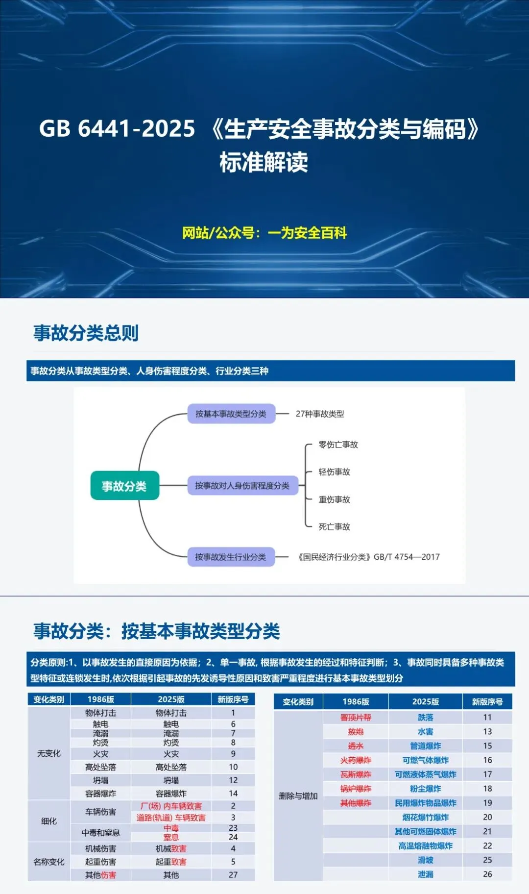 国家标准 GB 6441-2025《生产安全事故分类与编码》 的权威解读。全文围绕新旧标准(1986版 vs. 2025版)的对比、事故分类体系、编码规则及统计指标展开,主要内容如下: