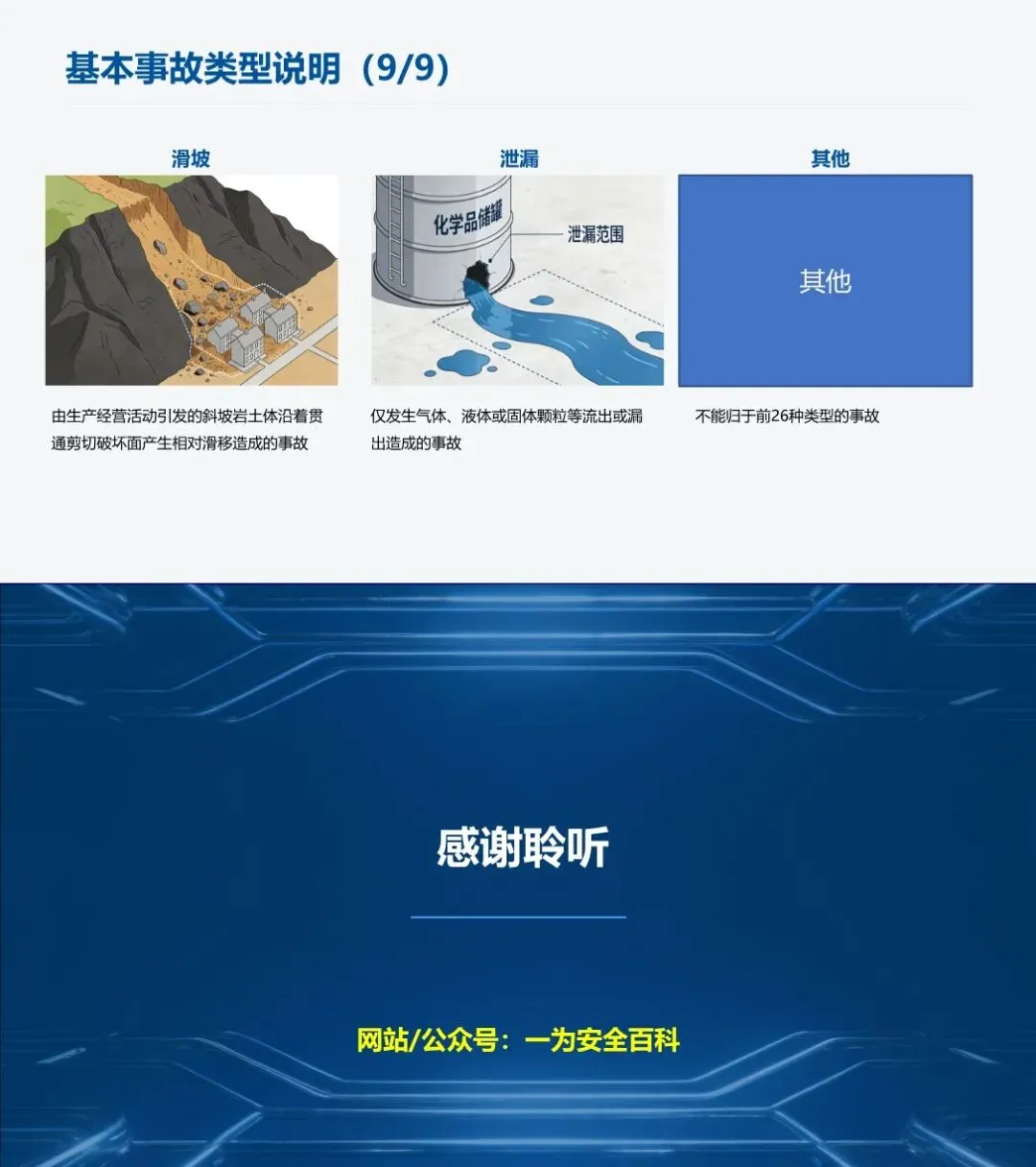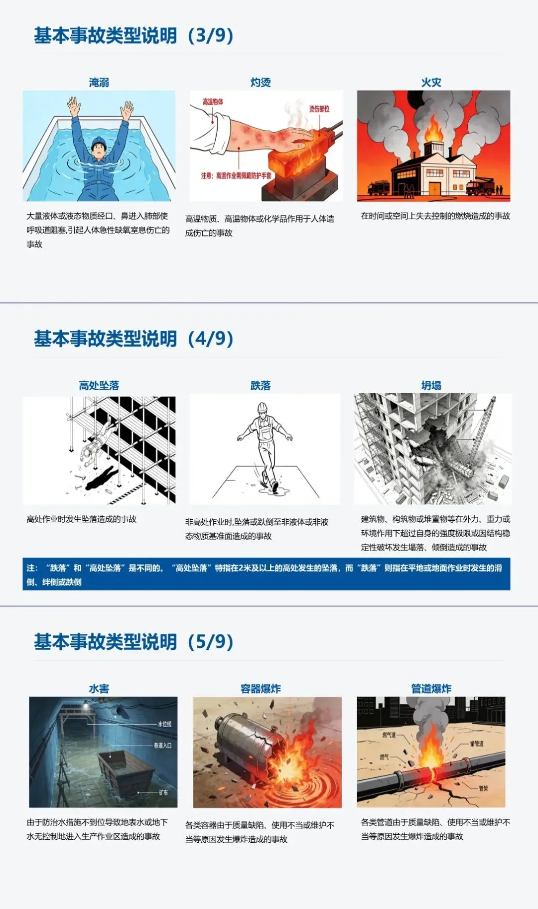 删除并新增的类型:删除了“冒顶片帮”“放炮”“透水”“火药爆炸”“瓦斯爆炸”“锅炉爆炸”等传统矿业术语,新增“跌落”“水害”“管道爆炸”“可燃气体/液体蒸气/粉尘/民用爆炸物/烟花爆竹/其他可燃固体/高温熔融物爆炸”“滑坡”“泄漏”等更贴近现代工业场景的类型。