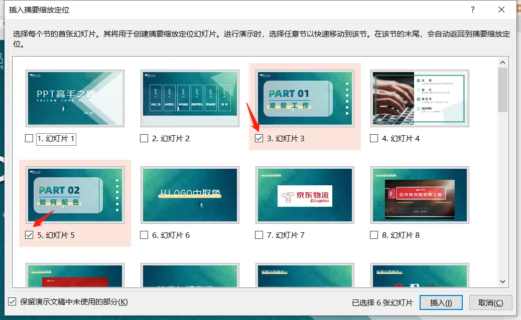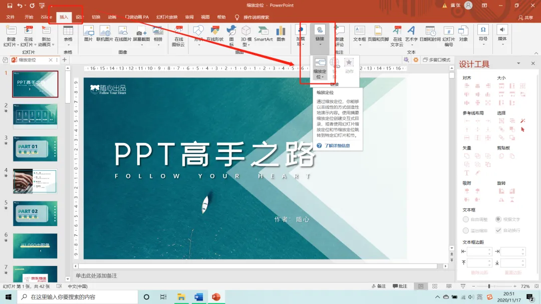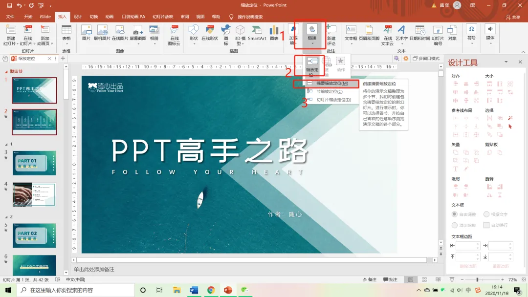 接下来【插入】-【链接】-【缩放定位】-【摘要缩放定位】。