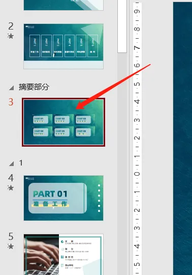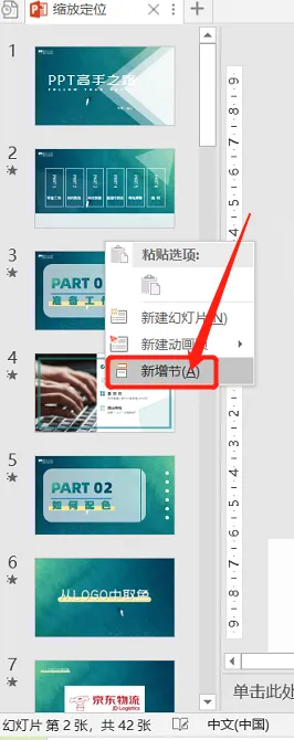 建议在每个过渡页前【新增节】这样就能很好的把整个PPT根据内容的不同分为不同的章节。