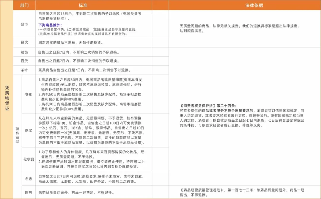 只有餐饮是“无条件”退换货,其余都是“有条件”退换货。