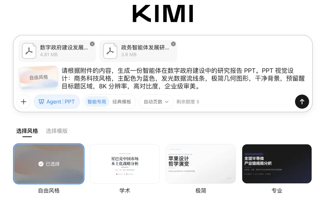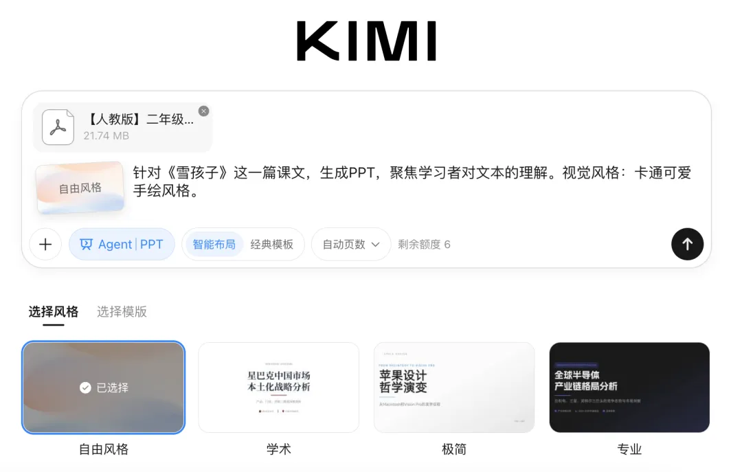 最近 Kimi 更新到了 2.5 版本,最大的亮点不是模型参数,而是它“变身”了——从一个单纯的对话框,变成了一个能帮你干活的 Agent(智能体)。主页显眼位置放了一张图:Kimi Agent 开始精通 Office。正好借着上篇文章的测试内容,对比一下新版 Kimi 和NotebookLM的PPT生成效果,看看 Kimi 有没有机会打败 NotebookLM。这次先拿简单的小学二年级语文课文《雪孩子》,让Kimi试一下。新版Kimi明显增加了Agent的元素,我们选择PPT功能。