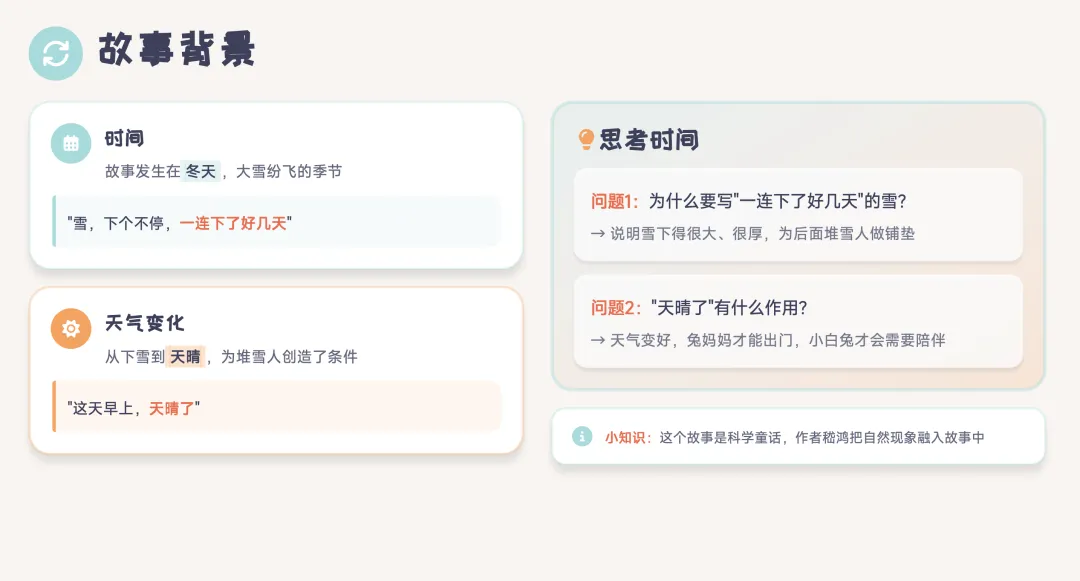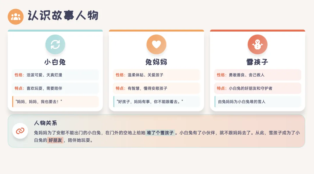 上传的也是课本pdf,也是同样的提示词:“针对《雪孩子》这一篇课文,生成PPT,聚焦学习者对文本的理解。视觉风格:卡通可爱手绘风格。”