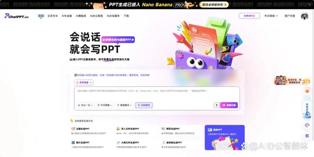 “一句话生成”与“多格式导入”兼顾:ChatPPT的输入方式极为灵活。你既可以只输入一个主题词,如“2026年市场营销策略”,让它自由发挥生成PPT;也可以上传Word文档、PDF文件甚至网页链接。它会智能提取文档中的核心内容,并自动联网搜索补充资料,生成结构完整、内容详实的PPT。例如,你上传一份5000字的商业计划书,不到2分钟,它就能生成一份包含封面、目录、正文、总结等完整结构的PPT,逻辑清晰,重点突出。而且,这个核心功能每日无限次免费使用。