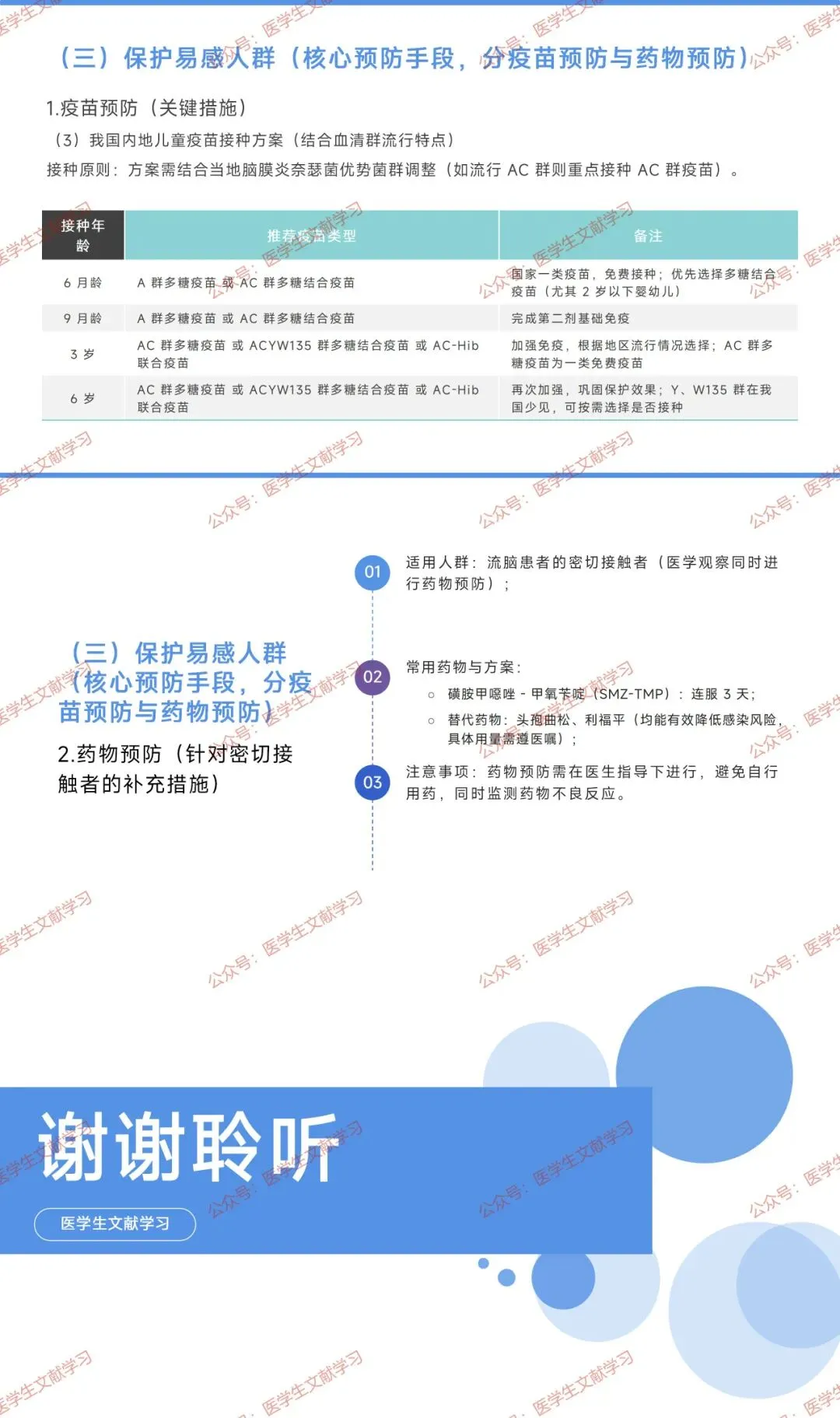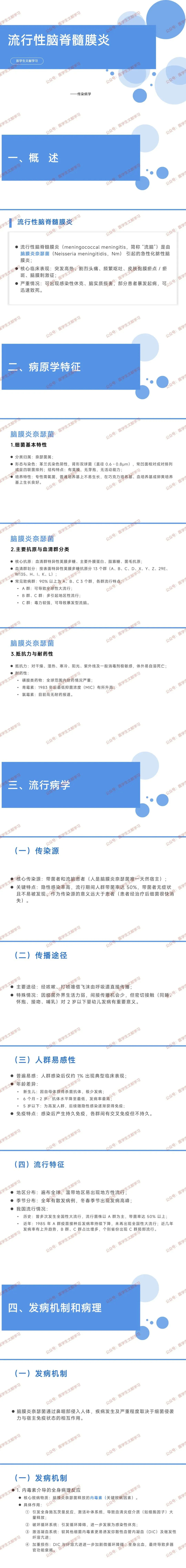 - 疫苗:多糖疫苗(2 岁以上)、多糖结合疫苗(全年龄段,婴幼儿优选),按流行群接种(如 AC 群)。