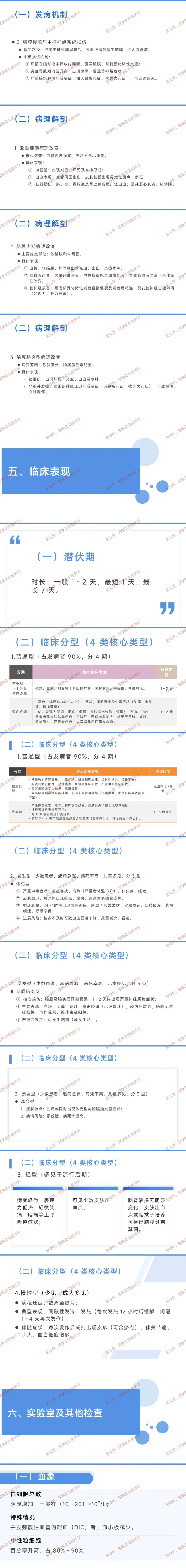 - 暴发型(急重,儿童多):休克型(瘀斑 + 循环衰竭)、脑膜脑炎型(昏迷 + 脑疝)、混合型(最凶险)。