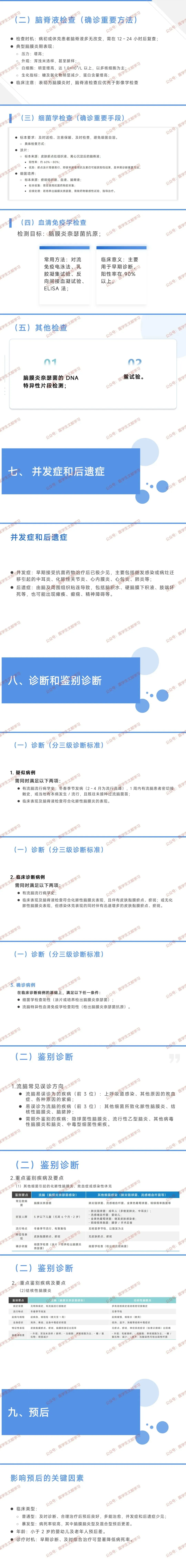 - 鉴别:与其他细菌性脑膜炎(无瘀点,致病菌不同)、结核性脑膜炎(慢起,脑脊液毛玻璃样)等区分。