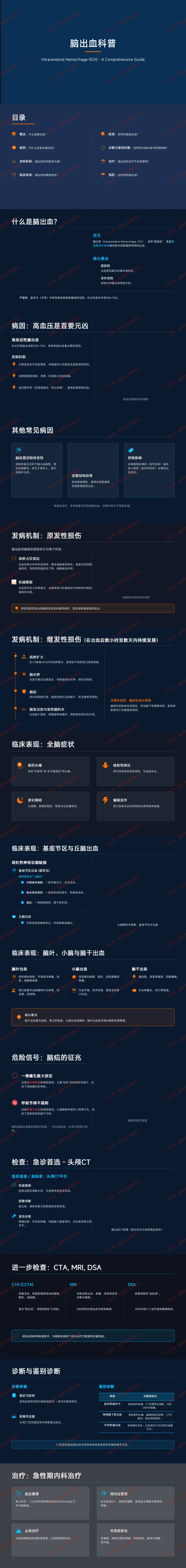 脑出血(ICH)是原发性非外伤性脑实质内血管破裂出血,为卒中亚型中致死率和致残率最高的类型,核心诊疗逻辑为 “早识别、快急救、控风险、防复发”,高血压是首要诱因,及时干预可显著降低不良结局风险。