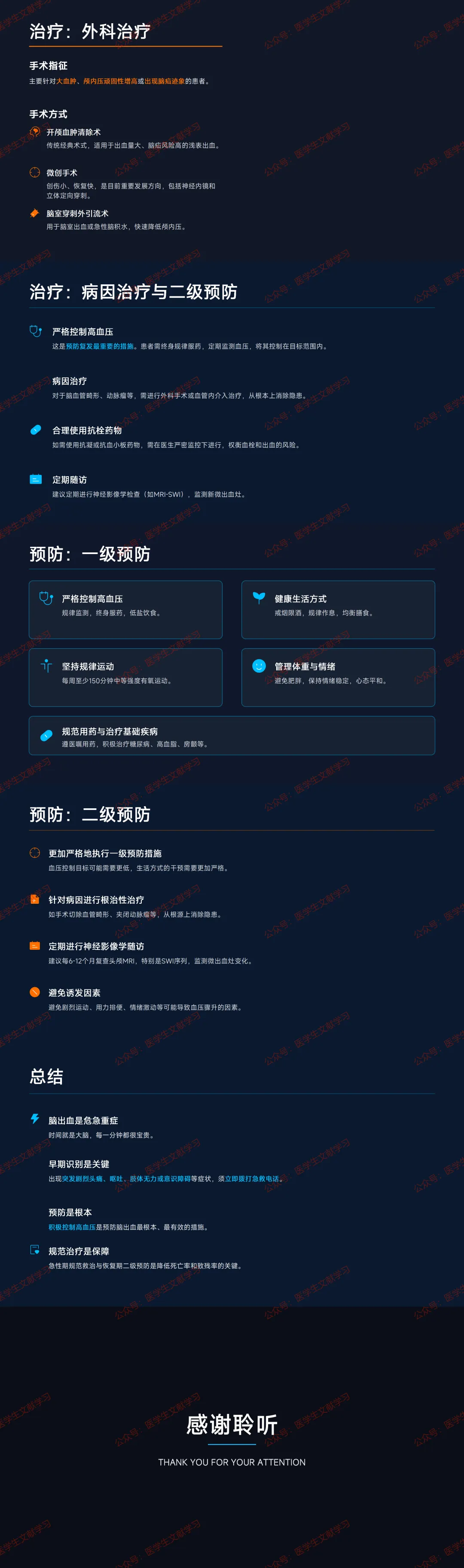 - 脑干出血:最凶险,突发深昏迷、四肢瘫痪、针尖样瞳孔,死亡率极高。