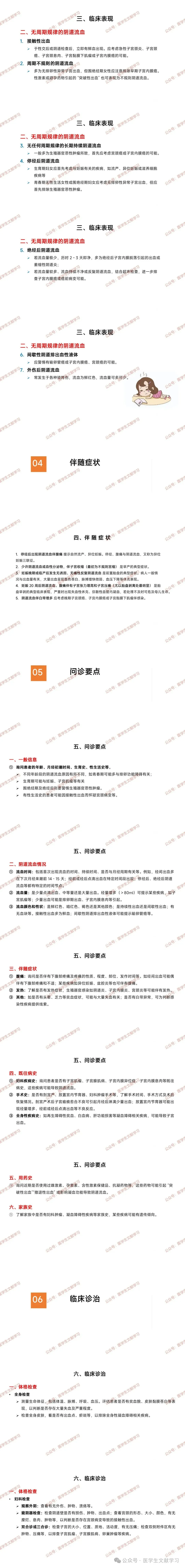 一般信息:询问患者的年龄、月经初潮时间、生育史、性生活史等,不同年龄段的阴道流血原因有所不同,有性生活史的患者可能因接触性出血而怀疑宫颈病变等。