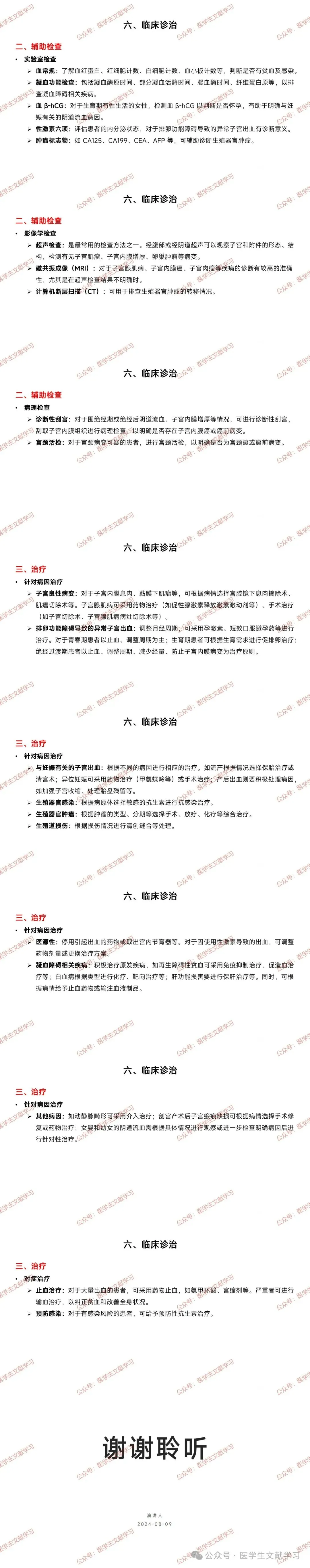 影像学检查:超声检查可观察子宫和附件的形态、结构,磁共振成像(MRI)对子宫腺肌病、子宫内膜癌、子宫肉瘤等疾病的诊断有较高准确性,计算机断层扫描(CT)可用于排查生殖器官肿瘤的转移情况。