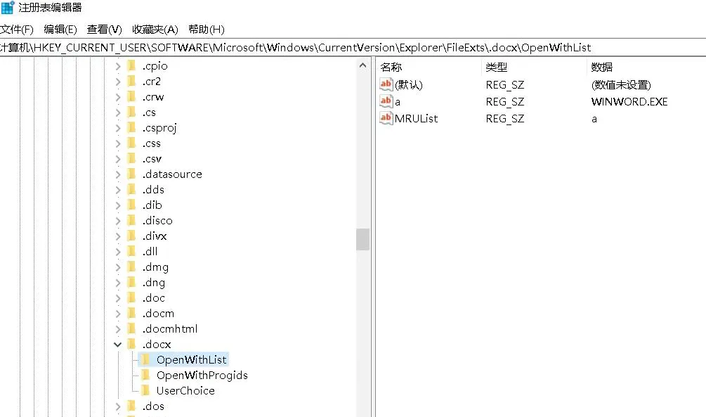 计算机\HKEY_CURRENT_USER\SOFTWARE\Microsoft\Windows\CurrentVersion\Explorer\FileExts\.docx