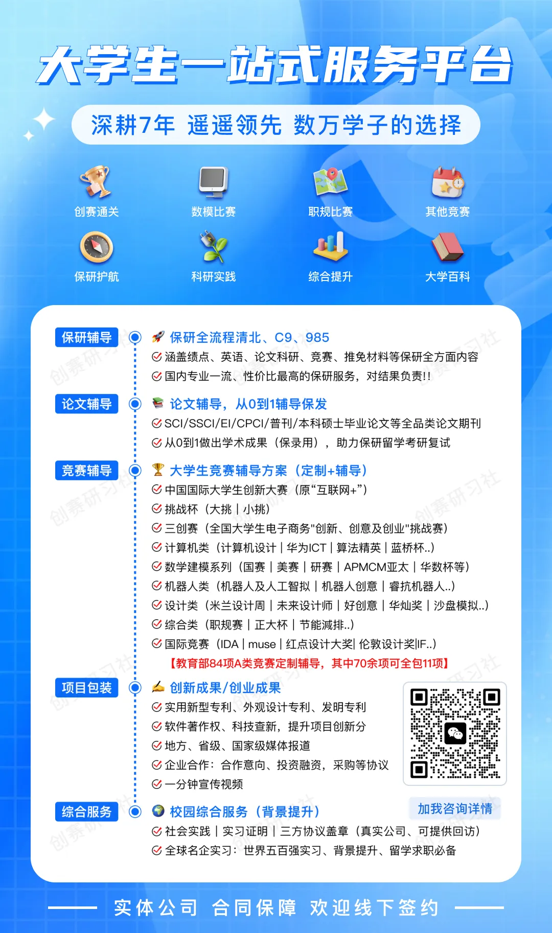获取近六年【挑战杯、中国国际大学生创新大赛(原“互联网+”)、三创赛、大创】省国奖案例 ⬇️ 可扫码下单(或添加我微信:Kr30265或Kr03256),感谢支持✨
