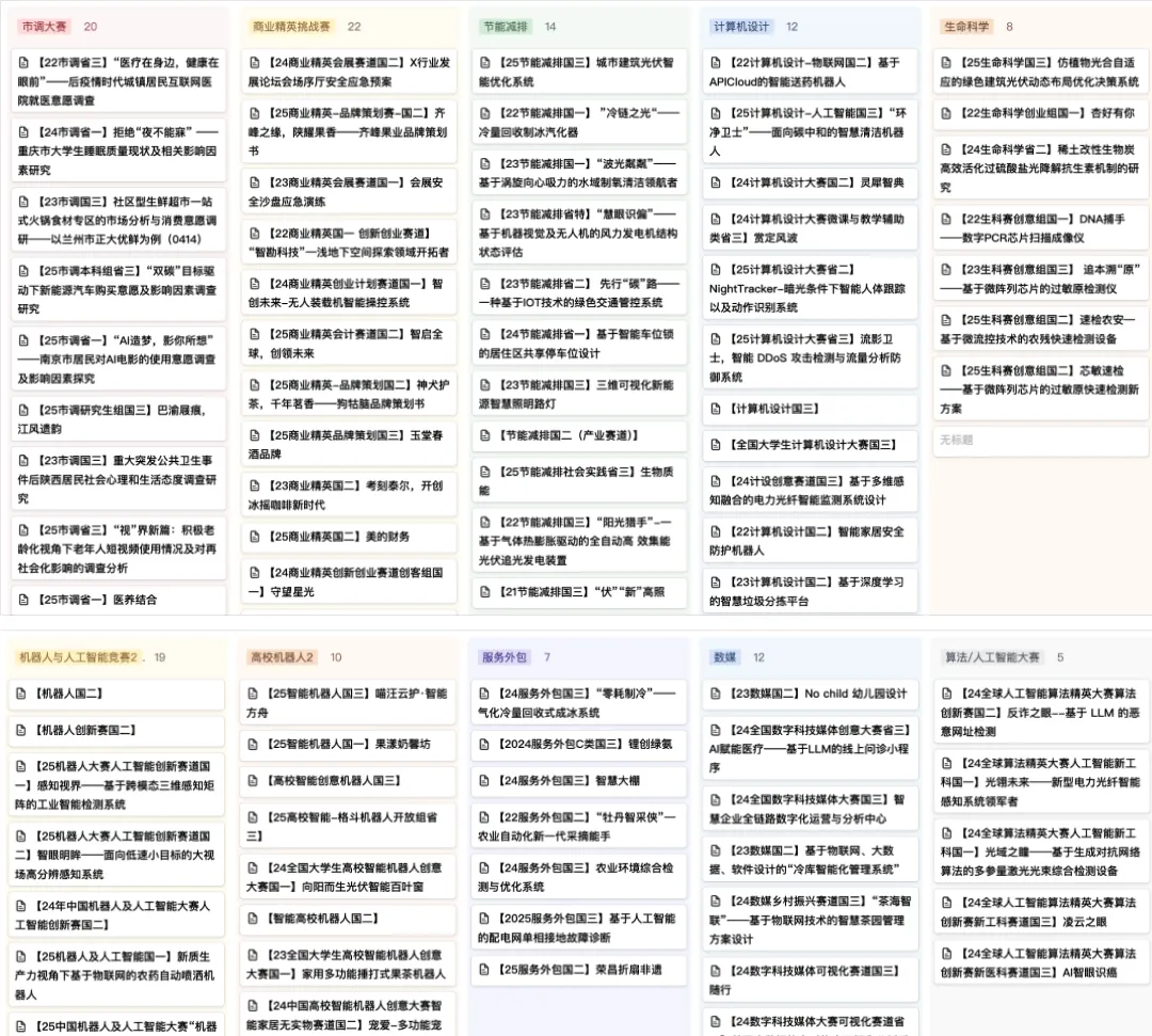 包含赛事:机器人创意、机器人及人工智能、睿抗机器人、机械工程创新、计算机设计、节能减排、服务外包、能源经济、三维、商挑、生科赛、正大杯、数媒、算法精英、统计建模、光电设计、计算机应用、东方设计、交科赛、冶金科技...