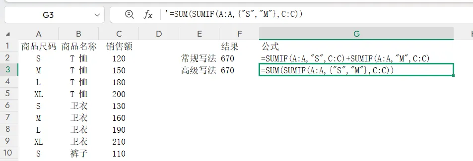 =SUM(SUMIF(A:A,{"S","M"},C:C))核心原理:用{}把多个条件打包成「常量数组」,让 SUMIF 一次性完成 S、M 两个尺码的条件求和,外层再用 SUM 把两个求和结果直接汇总,一步到位出总数值!