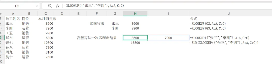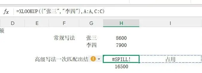 =XLOOKUP({"张三","李四"},A:A,C:C),这个会批量返回结果,但是得注意,公式在H5单元格里书写会向右自动拓展一列,需要保证右侧没有数据,否则会报错:#SPILL!