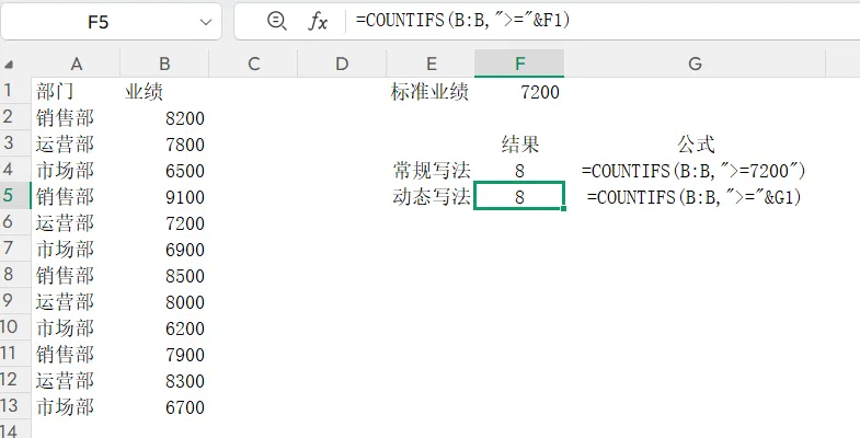 =COUNTIFS(B:B,">="&G1)函数会先读取 G1 的达标值,再组合成>=7200(假设 G1=7200)的有效条件。