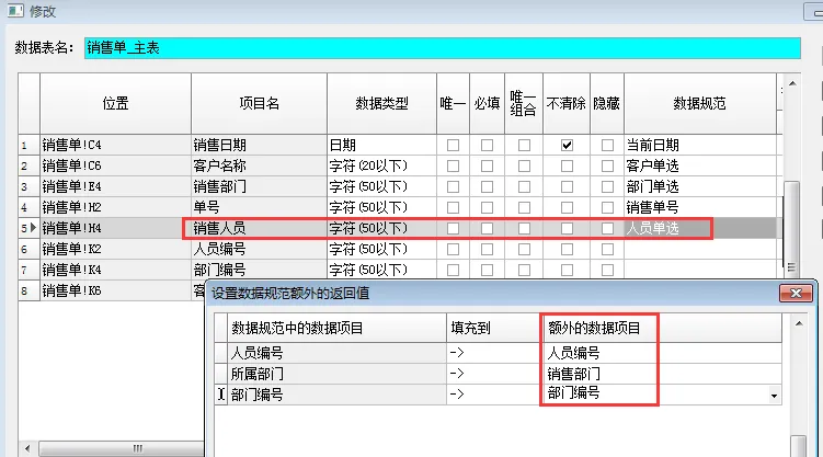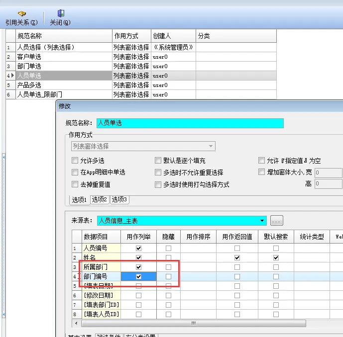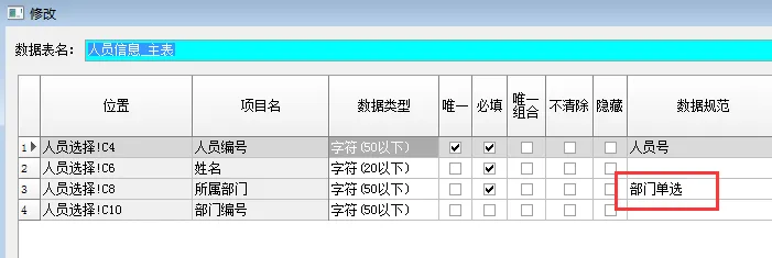 我们修改原来的数据规范“人员单选”把新增的 “所属部门”和“部门编号”两个字段加上