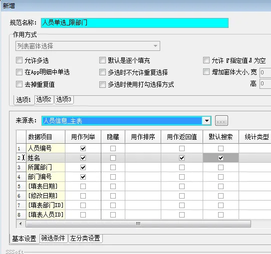 然后,在人员信息表中给“所属部门”字段增加数据规范“部门单选”,这样我们就可以在录入销售人员时,同时选择其对应的销售部门了。而且这个要勾选"必填"。