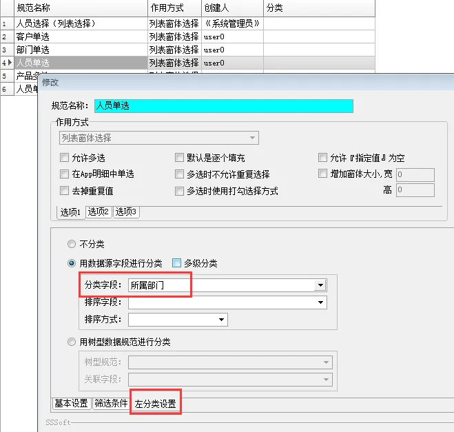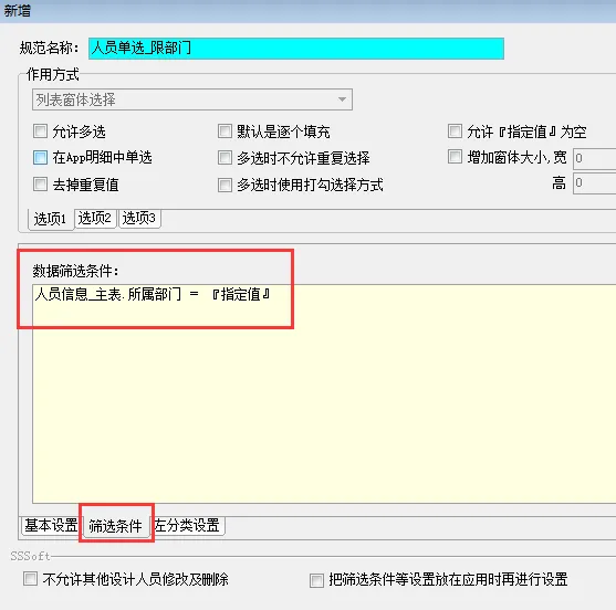 再在系统管理-数据规范-列表窗体规范中增加一个“人员单选_限部门”的数据规范。
