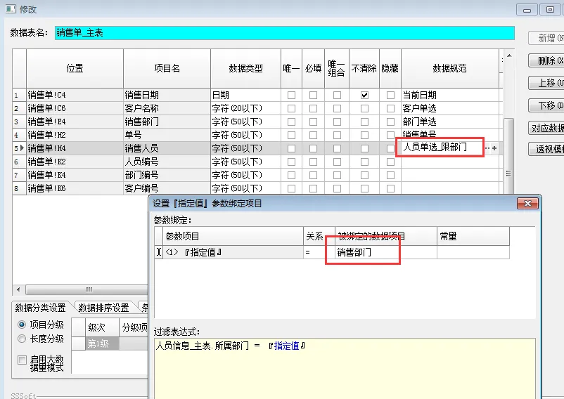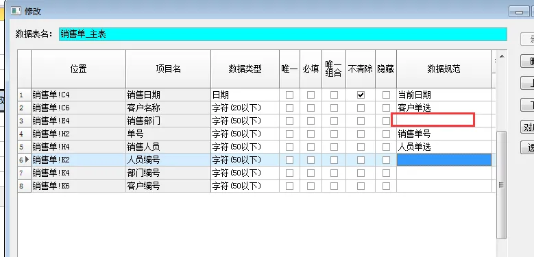 然后,再修改销售单中 “销售人员”字段的数据规范。