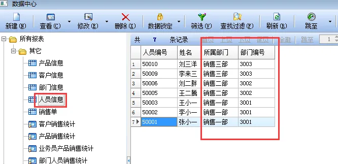 修改完成后,我们需要回到数据中心的“人员信息”中把销售人员的“所属部门”信息补全。