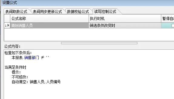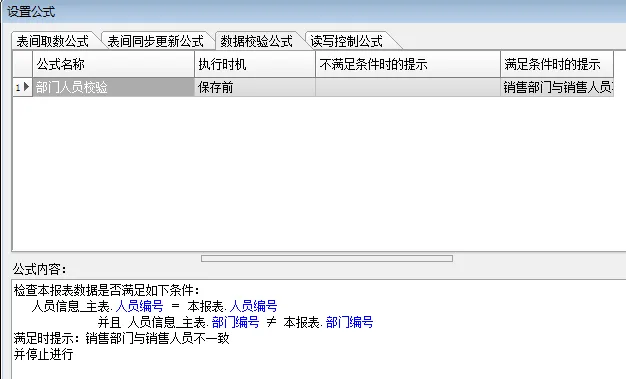 我们还可以通过给销售单加一条数据校验公式,在保存前判断当前销售人员与人员信息表中的所属部门是否一致。如果不一致,就不允许保存。