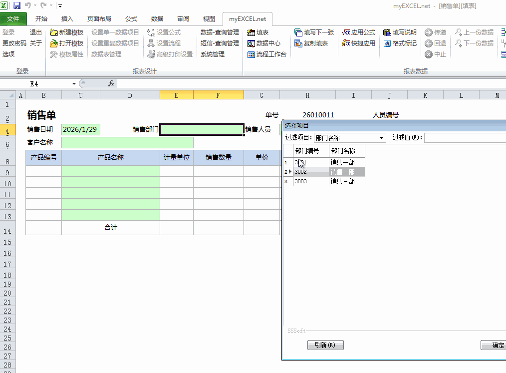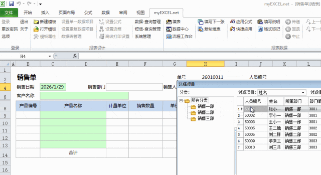 那么,我们在录入时,如果录入销售部门后,在销售人员的列表中应该只显示该部门的人员,这样就可以避免了销售部门与销售人员不对应的问题,现在我们来看一下在Myexcel中这个问题是如何解决的。