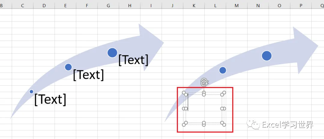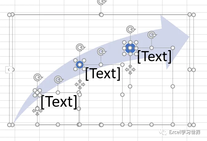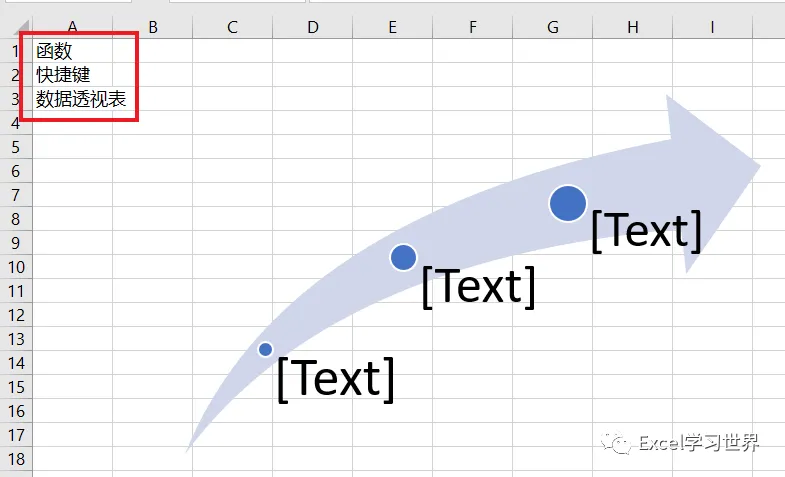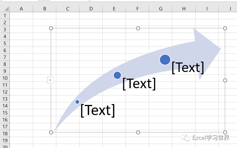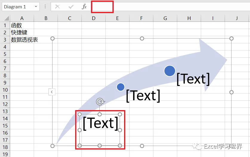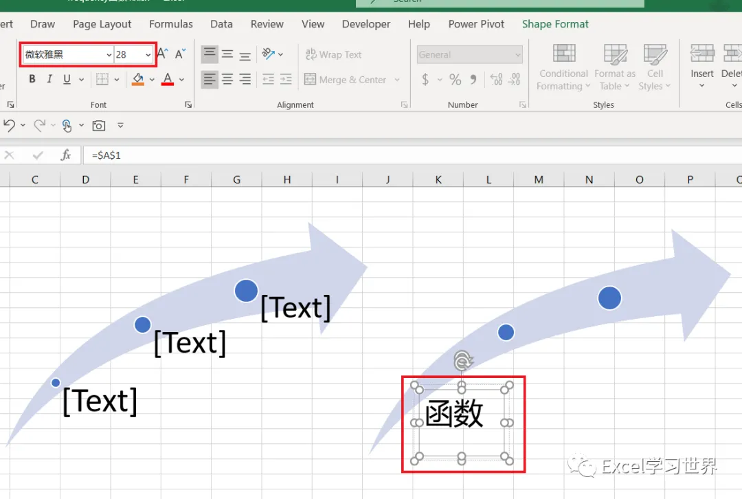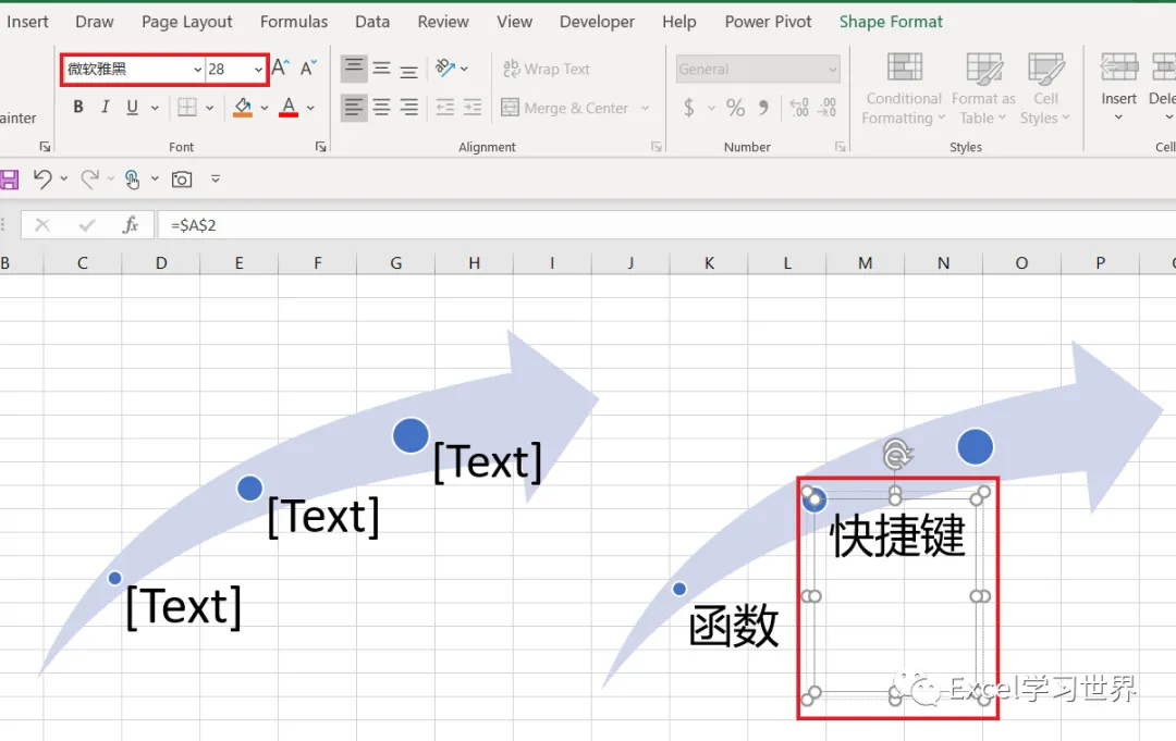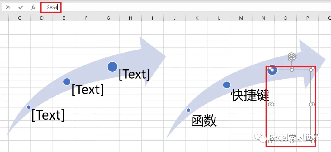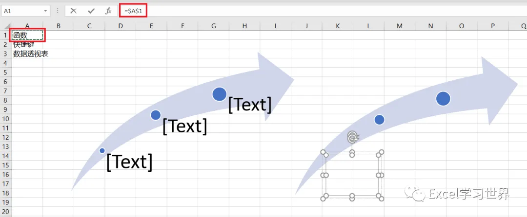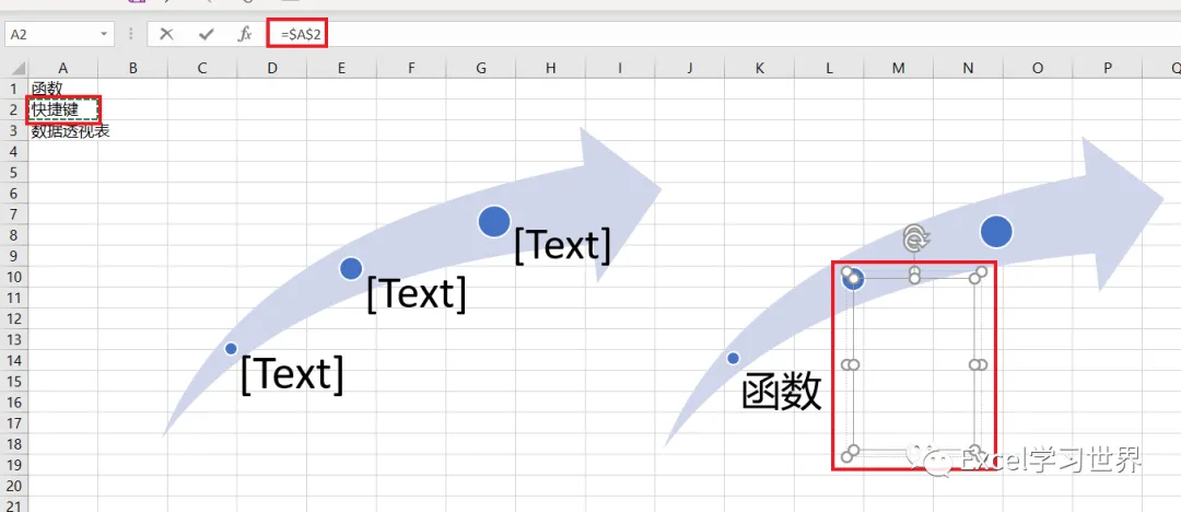 现在右边的 SmartArt 图形的文本框已经完成了动态设置,全都等于 A 列中指定单元格的内容。