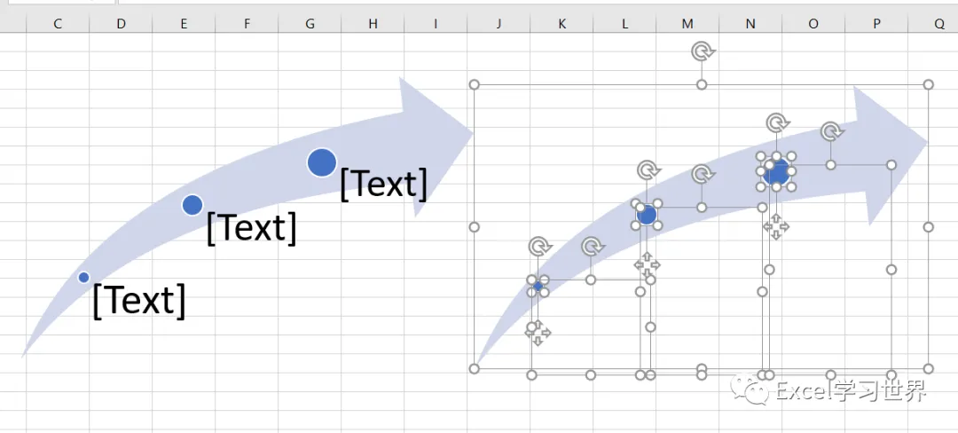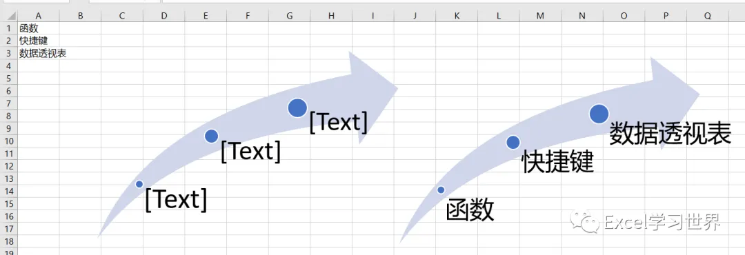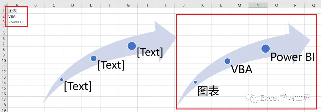 将普通的 SmartArt 图变成动态的,下图中右边那个就是。当 A 列的数据变动时,SmartArt 中的文本自动随之更新。