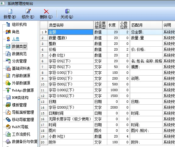 虽然系统定义了20种数据类型,但总结一下就几种:数值,文字,日期,图片,附件,无限长度字符。